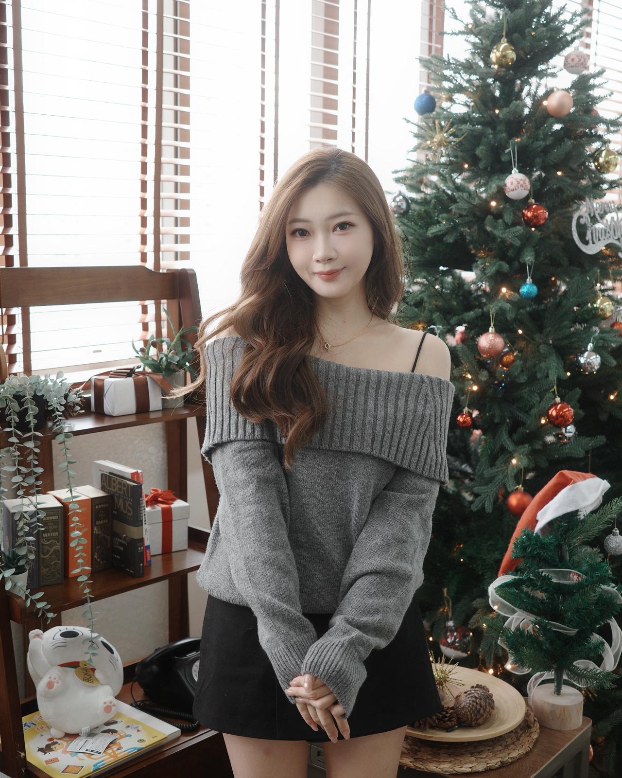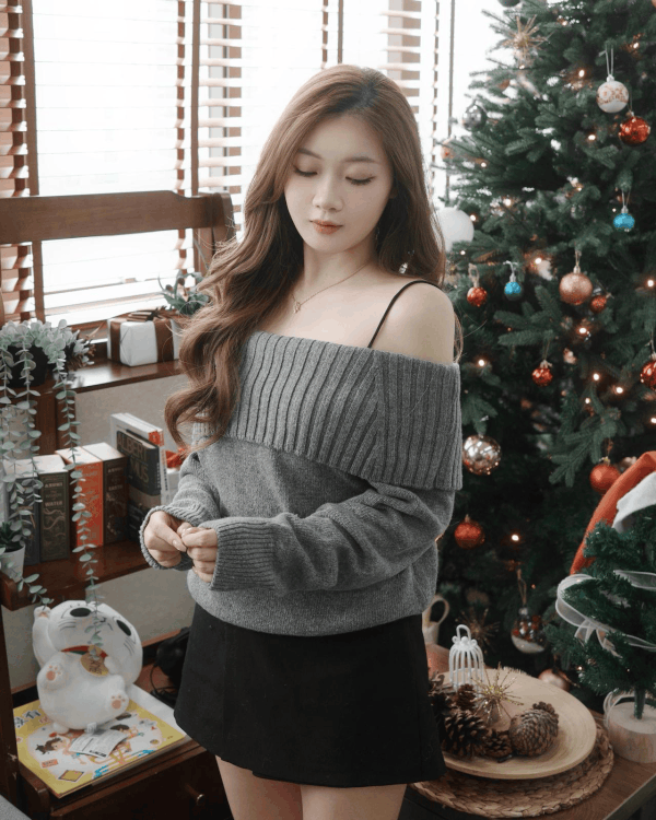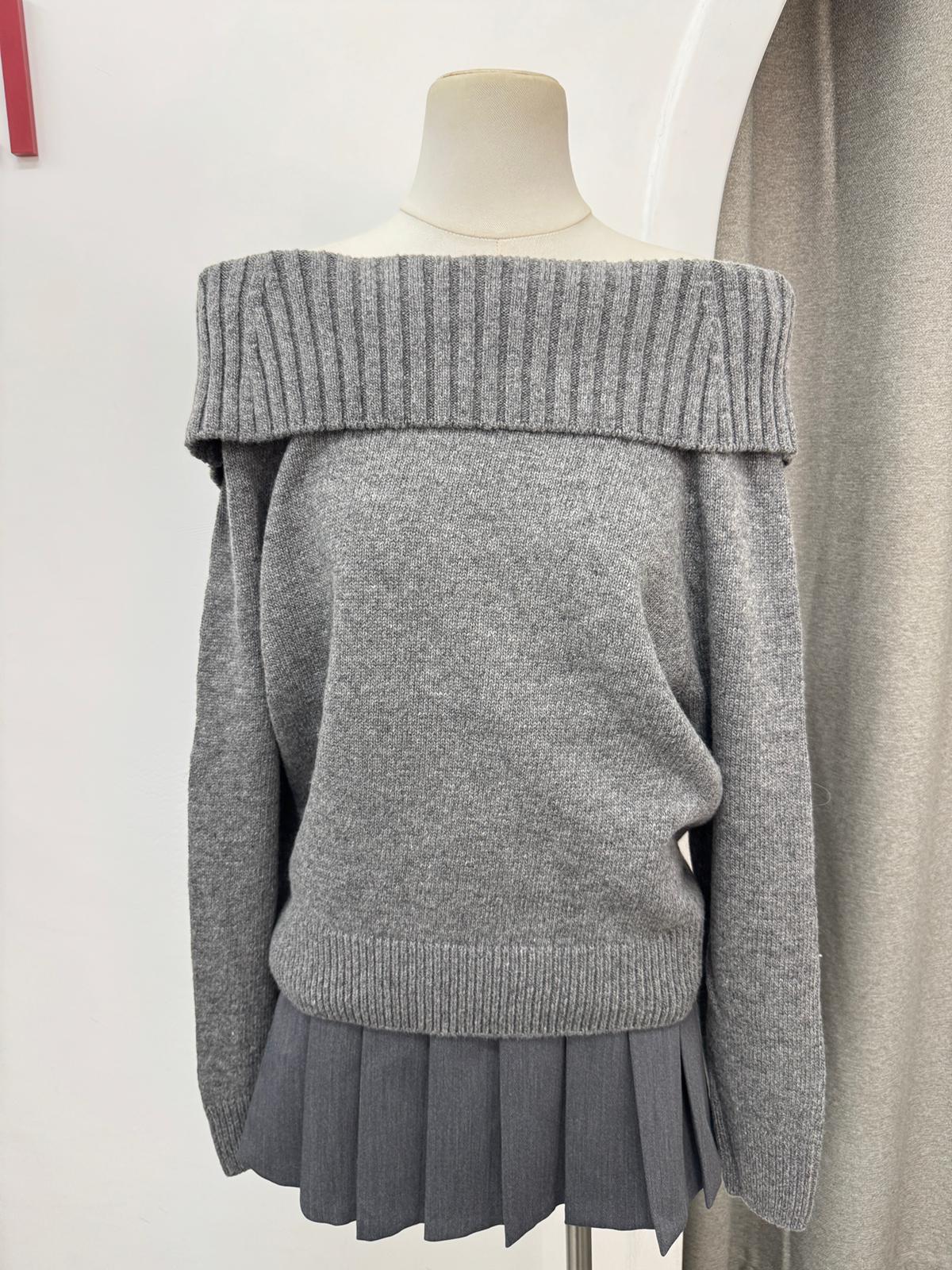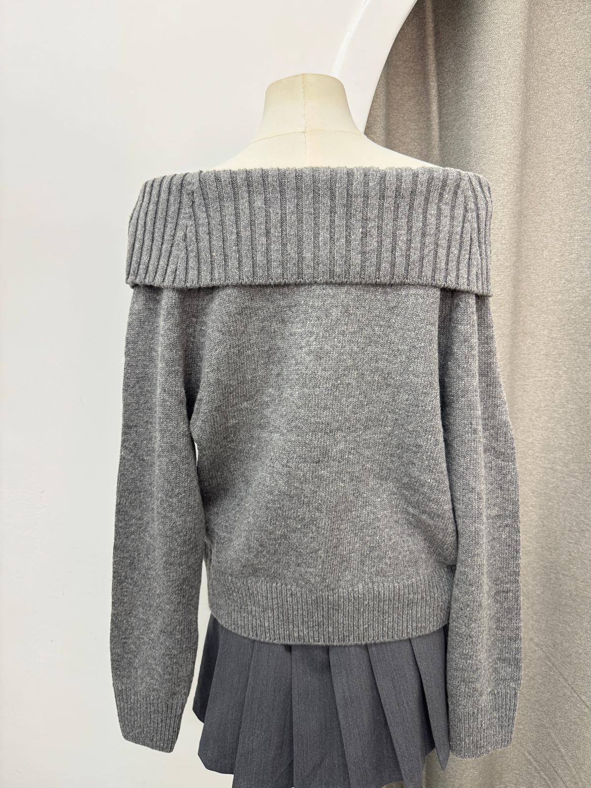 反褶一字肩針織上衣